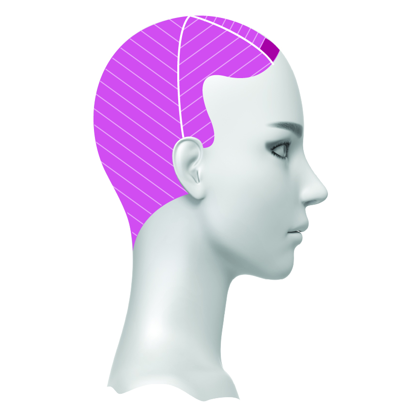 Step 1: Am Oberkopf drei dreieckige Sektionen im vorderen Bereich abteilen.