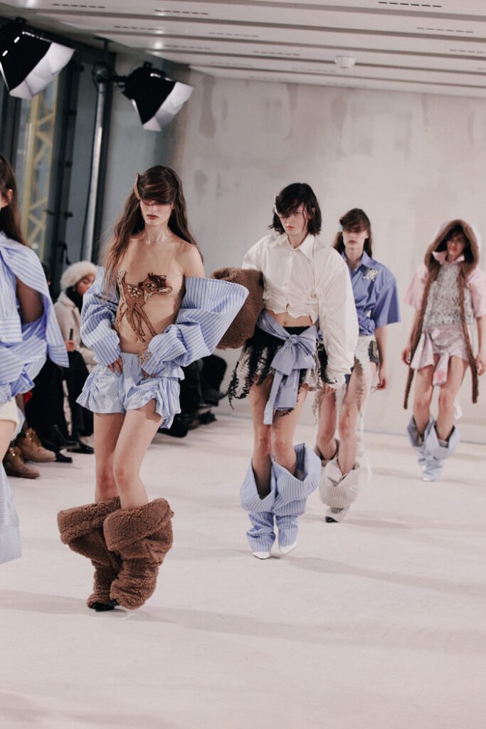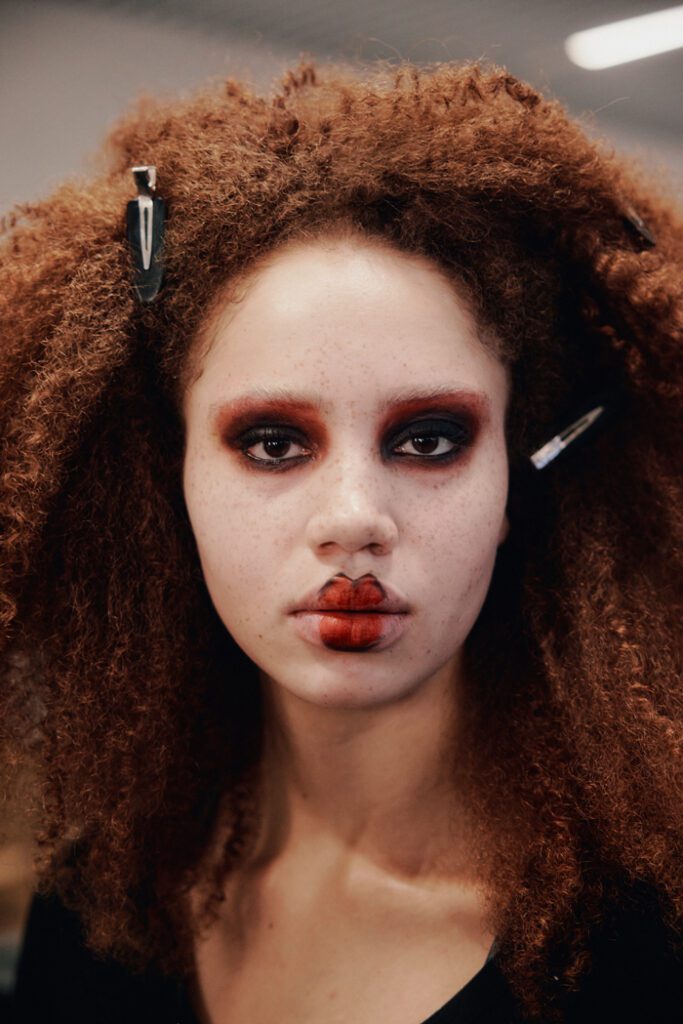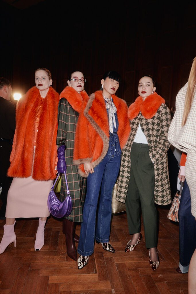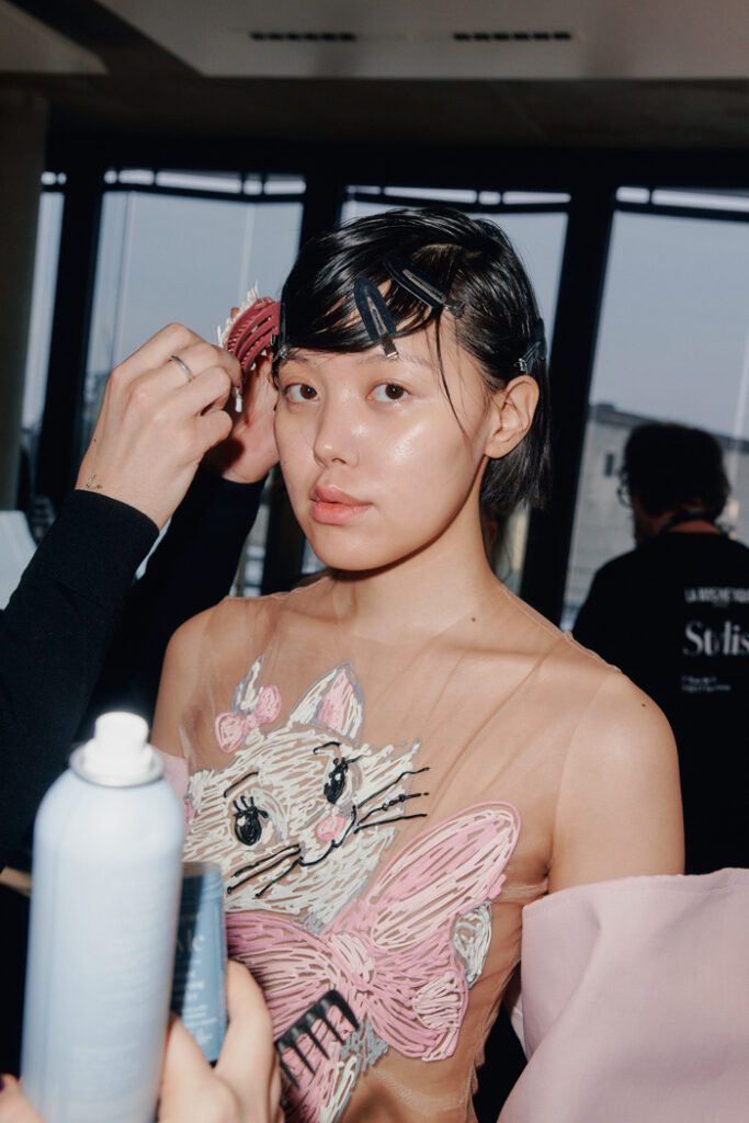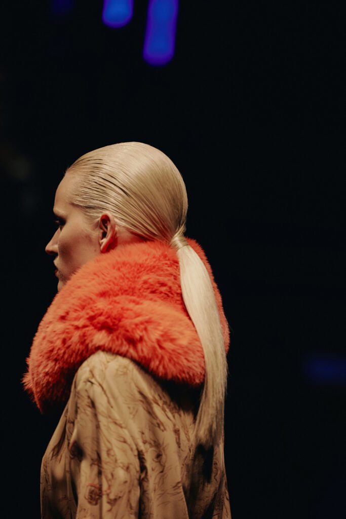 In Bezug auf die Silhouetten wurden Klassiker auf typische Orange Culture-Art neu interpretiert – mit kindlicher Verspieltheit, Eigenwilligkeit und dem charakteristischen androgynen Geist der Marke. Zu den Highlights zählten die Print-Pieces, von Hand bestickte Looks und neu interpretierte klassische Silhouetten. Auch im Haardesign von Alexander Dinter und seinem Team von Stylist:innen spiegelte sich die Vielfalt der Modelle und ihrer individuellen Typen wider.