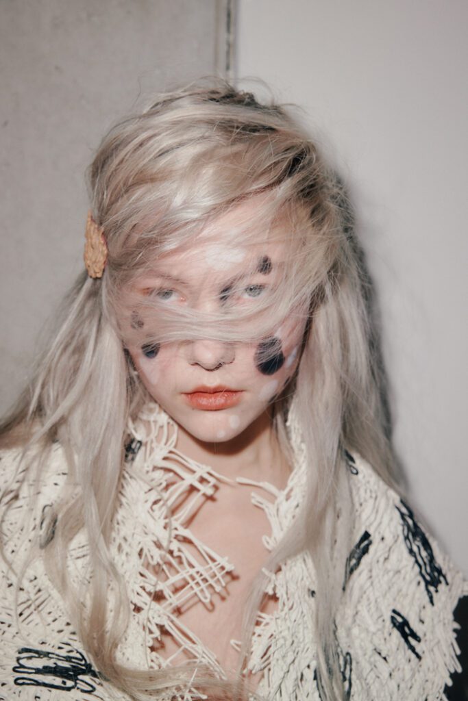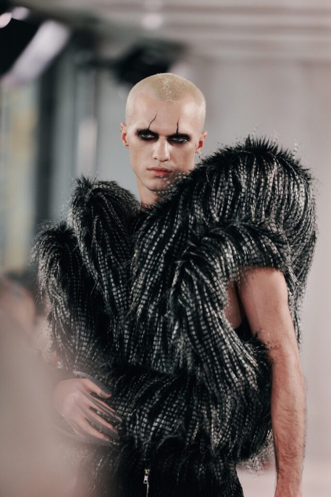 Die Silhouetten bewegen sich zwischen Schutz und Entblößung: von umhüllenden Schnitten über Second-Skin-Pieces bis hin zu skulpturalen Volumen, die dennoch körpernah anlagen. Messy, rau und ungemacht zeigten sich die Hairstyles, die Alexander Dinter und sein Team passend zur Mode von Kasha entwarfen.