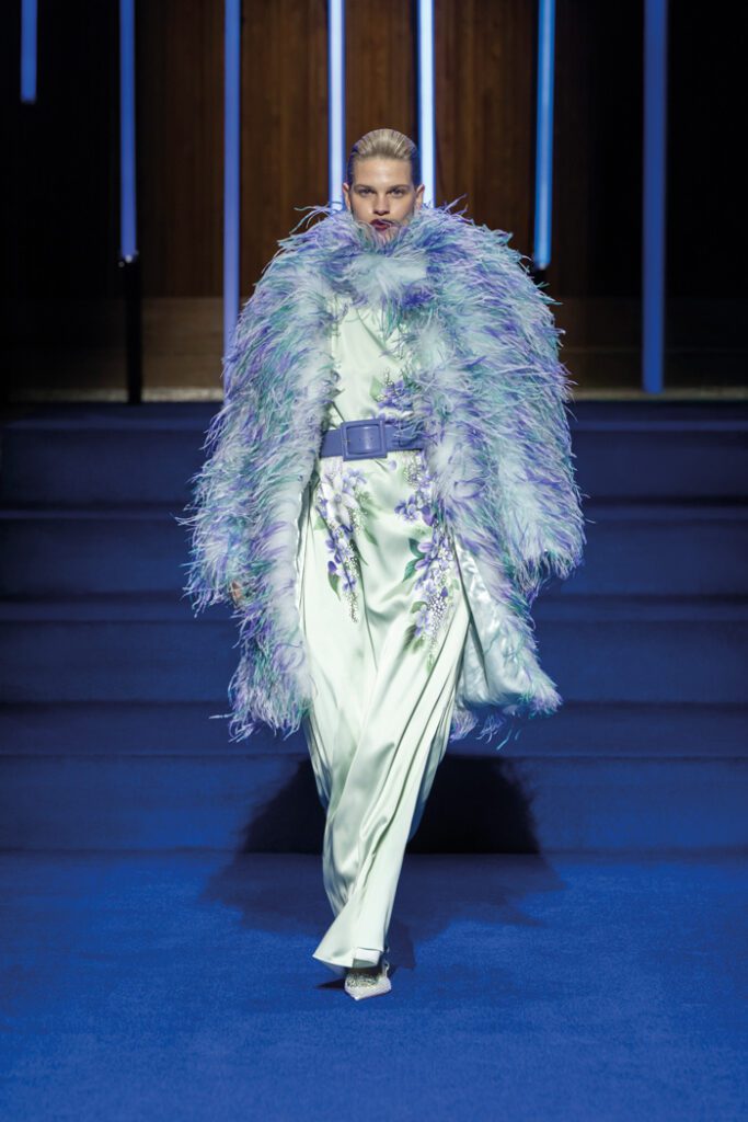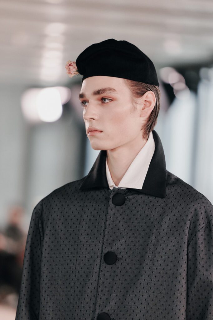 Interessant waren auch seine Spiele mit Volumen, mit matten und glänzenden Materialien sowie luxuriösen Stoffen. Insgesamt kontrastierte die Kollektion strenge, einheitliche Silhouetten von Businesskleidung mit historisch inspirierten Materialien und Farben und legte die Spannung zwischen „Wissen“ und „Glauben”, Humanismus und Gier, Aufklärung und Überschwang, Individualität und Uniformität offen.