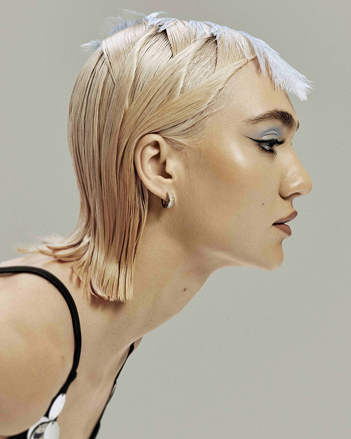 Bild eines blonden Models mit Lilanem Kleid für das Intercoiffure Mondial Trend Editorial