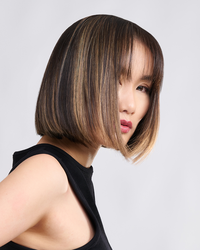 Foto eines Models vor einer sommerlich blauen Wand mit einem kurzen, dunkelbraunem Bob Haarschnitt für die Sommertrends von Paul Mitchell